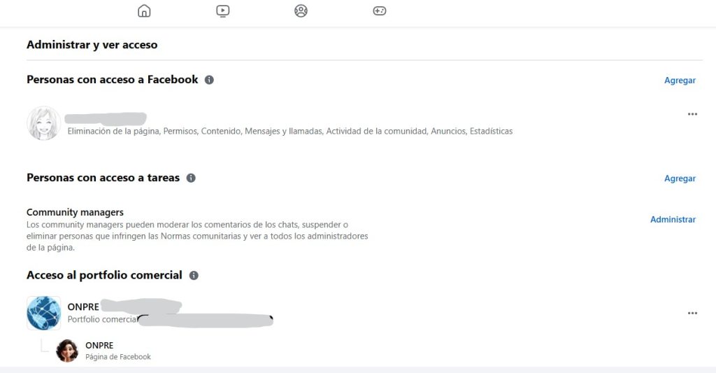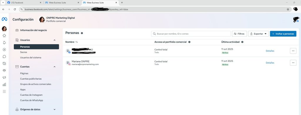 Como ves, en el caso de mi página hay dos administradores con «control total» del portfolio comercial [si necesitás definiciones de esto click aquí]. Ambas cuentas son mías. Esto es algo que recomiendo porque en caso de perder acceso a una de las cuentas siempre quedará la otra.