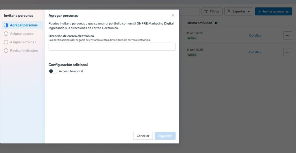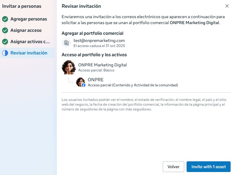 La persona invitada recibirá un email con la invitación y debe aceptarlo. El email tarda máximo 10 minutos en llegar. Si no recibe el email, recomiendo ver en la carpeta spam o correr una búsqueda en el inbox de la cuenta de correo para buscar emails de «meta», «facebook» o «instagram».