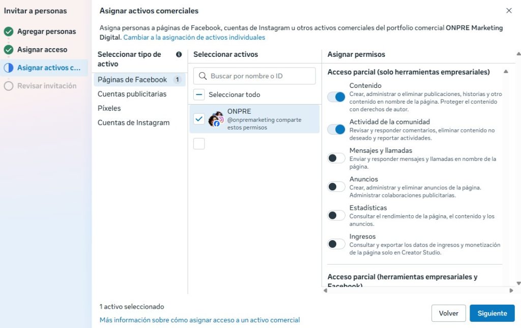 En este ejemplo, estoy creando el permiso de alguien que va a crear contenido y responder mensajes en una sola de las cuentas.