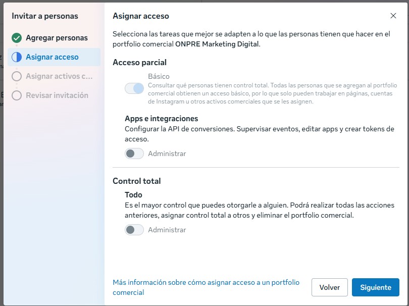 - Si llegás a los links que te dejé y no ves las opciones que menciono, estás buscando la opción mientras está seleccionado un perfil de persona/negocio/página/cuenta distinto, que no tiene permisos para agregar colaboradores. Revisá bien este punto.
